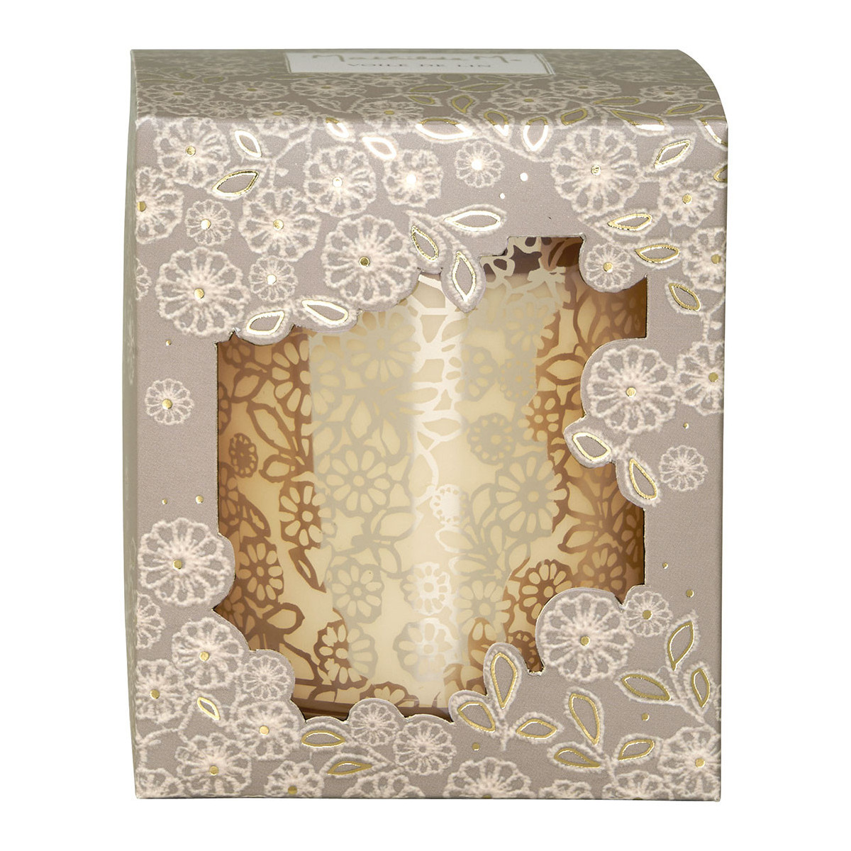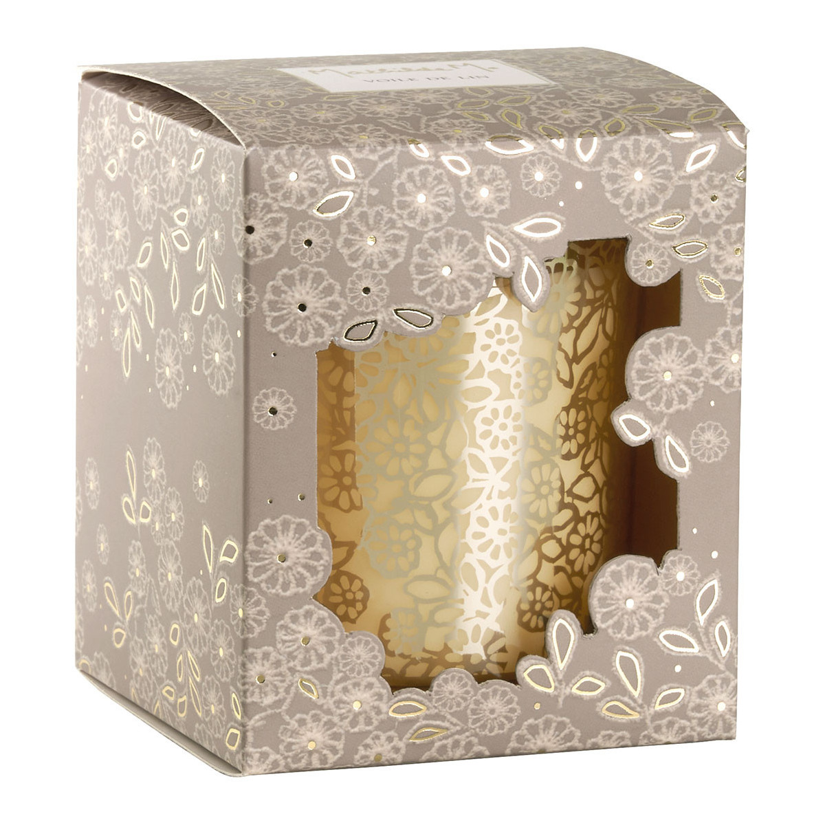 Collection De Fleurs et d’Or Symbole du raffinement et de la haute couture française, la dentelle est omniprésente à la cour de Versailles au 18e siècle, richement arborée par les femmes comme par les hommes. Dans sa nouvelle collection, le Studio de Création Mathilde M rend hommage à ce tissu précieux travaillé en fil d’or. Nos conseils d’entretien pour une combustion harmonieuse Lors de la première utilisation, veillez à laisser la cire fondre sur toute la surface afin d’éviter qu’un « tunnel » ne se forme aux prochaines utilisations. Recoupez les mèches de la bougie à 5 millimètres de hauteur…