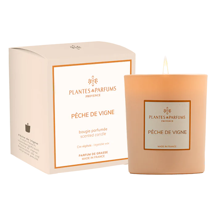 Offrez un moment d’évasion avec la Bougie Parfumée Pêche des Vigne 180g avec étui Plantes & Parfums de Provence, un parfum doux et fruité qui évoque les vergers ensoleillés du Sud. La pêche de vigne, mêlée à des accents frais d’orange et de cassis, crée une atmosphère douce et agréable. Présentée dans un élégant étui, cette bougie parfumée est un cadeau parfait pour les amateurs de senteurs estivales et gourmandes. Son parfum fruité se diffuse subtilement, apportant une ambiance agréable et chaleureuse. Bougie parfumée fabriquée en France