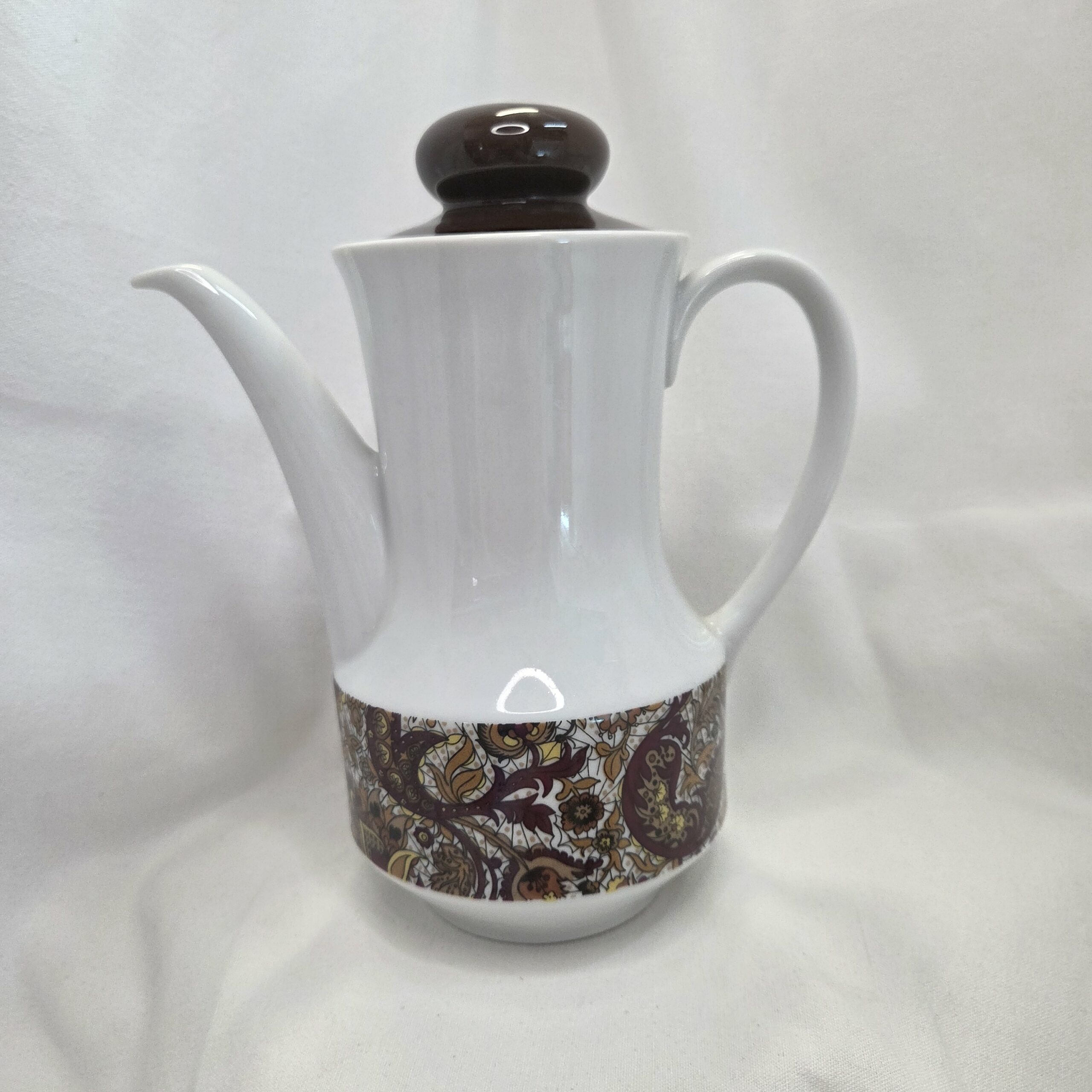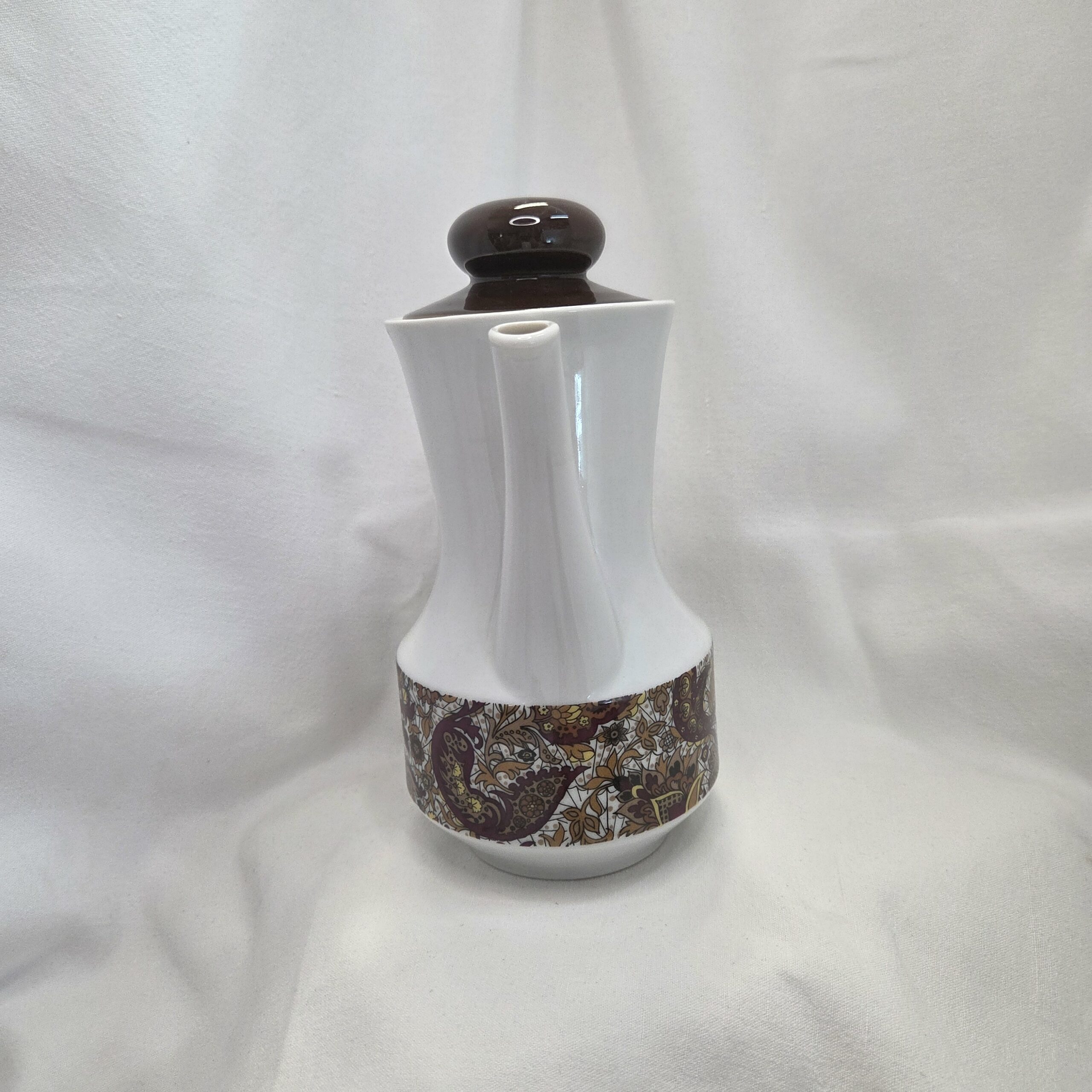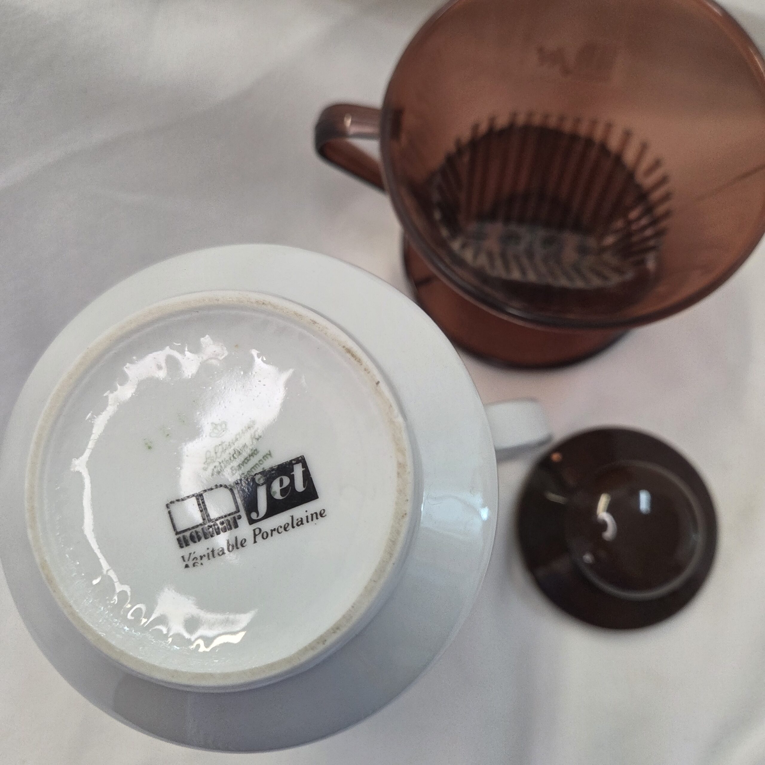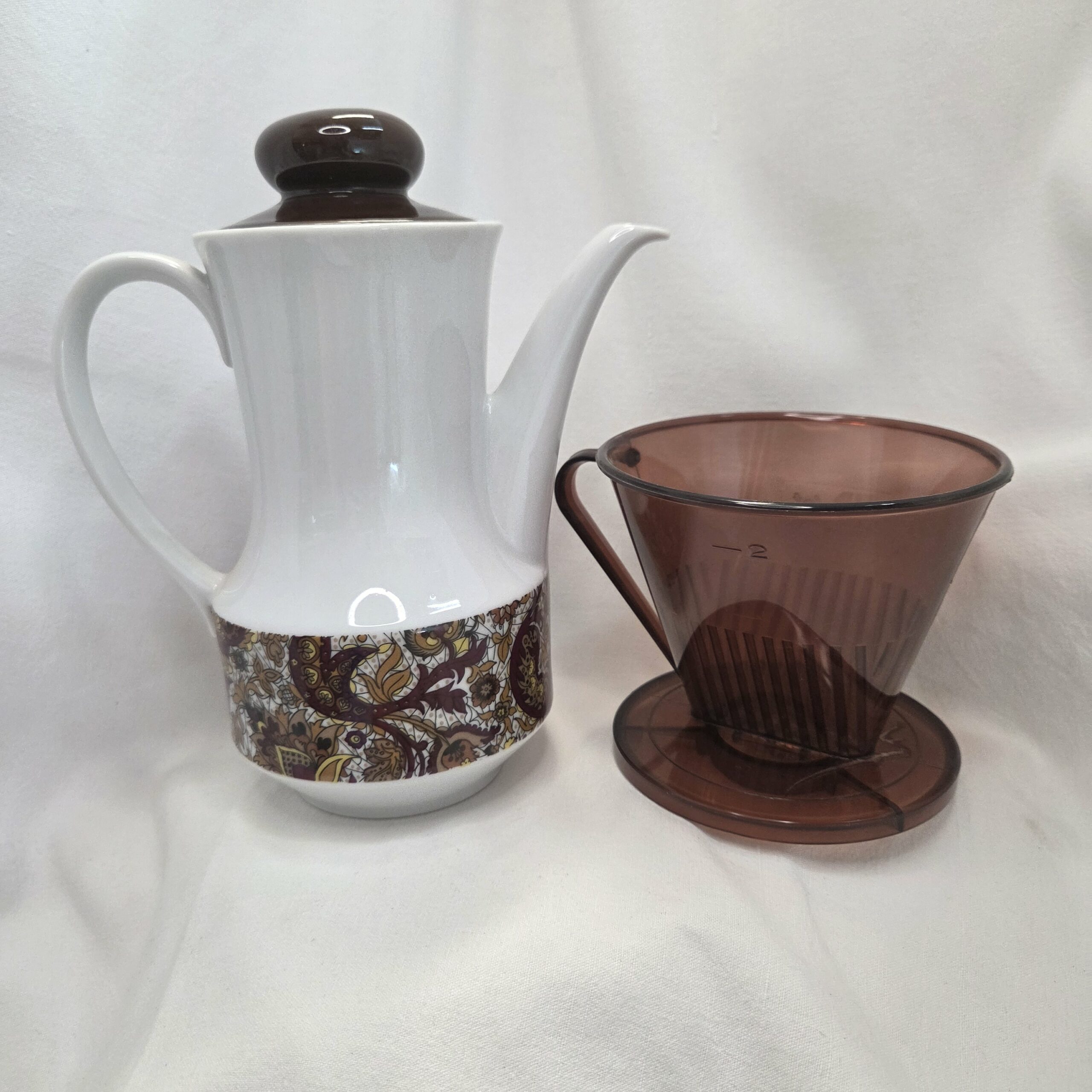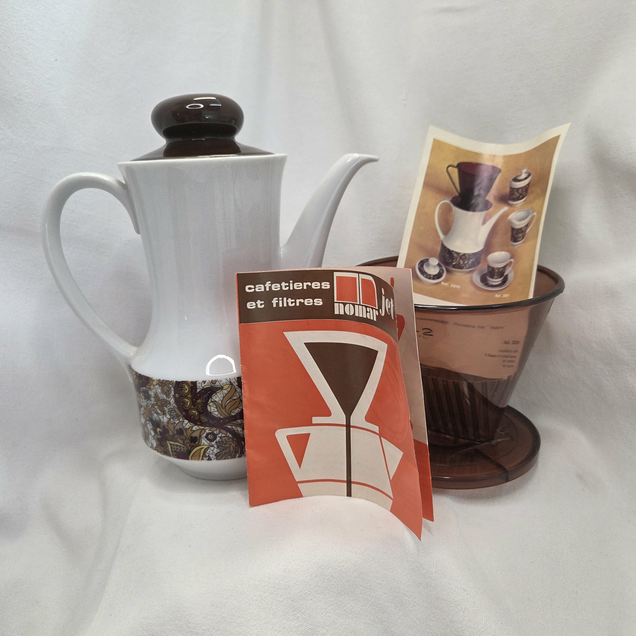 Très jolie cafetière vintage Nomar Jet, en porcelaine. En parfait état, laissez-vous séduire par son esprit seventies et son allure élégante. Vous adorerez lire son mode d’emploi d’origine qui vous plonge dans une autre dimension ! Le filtre, également d’origine présente une fêlure à sa base qui n’empêche pas son utilisation. (voir zoom photo)