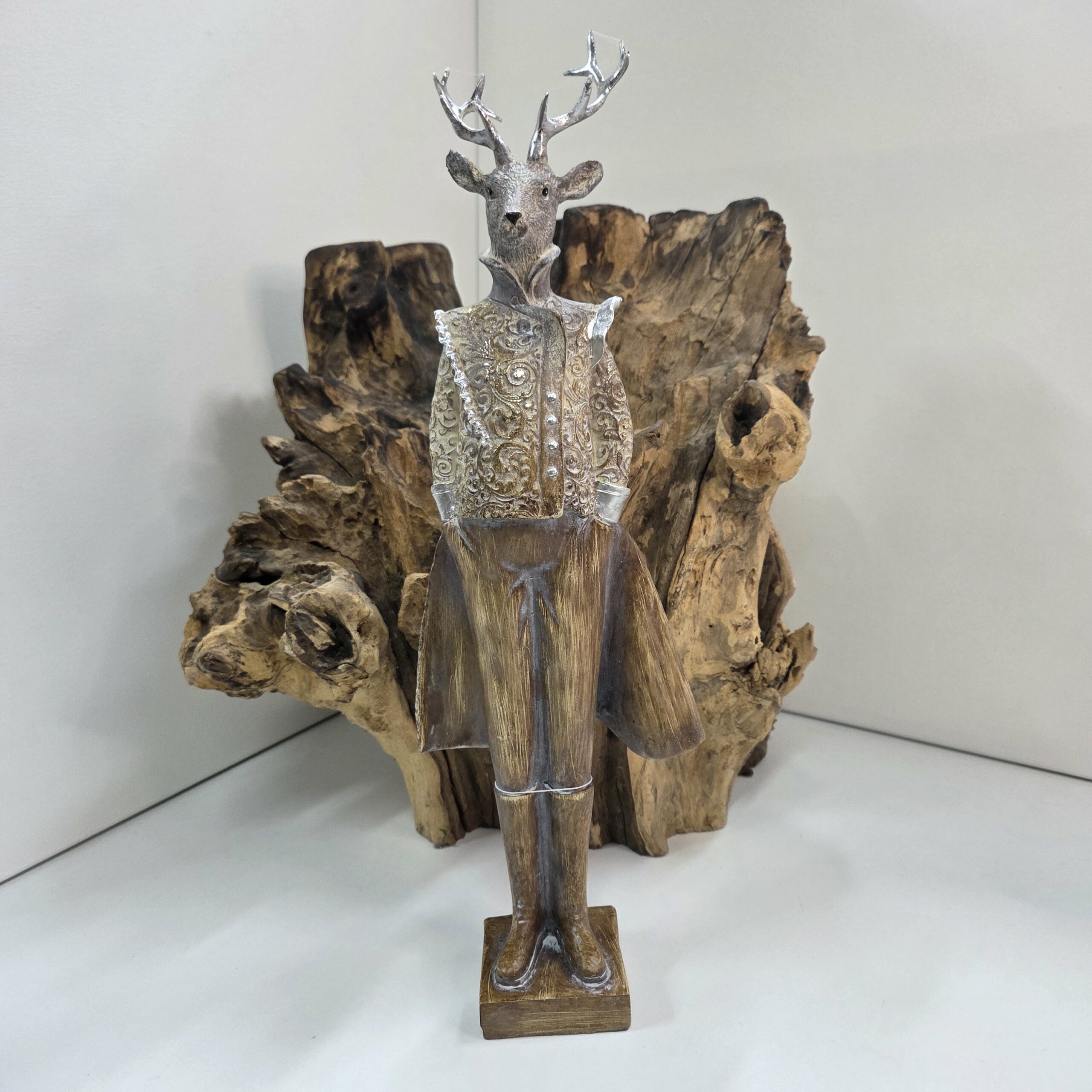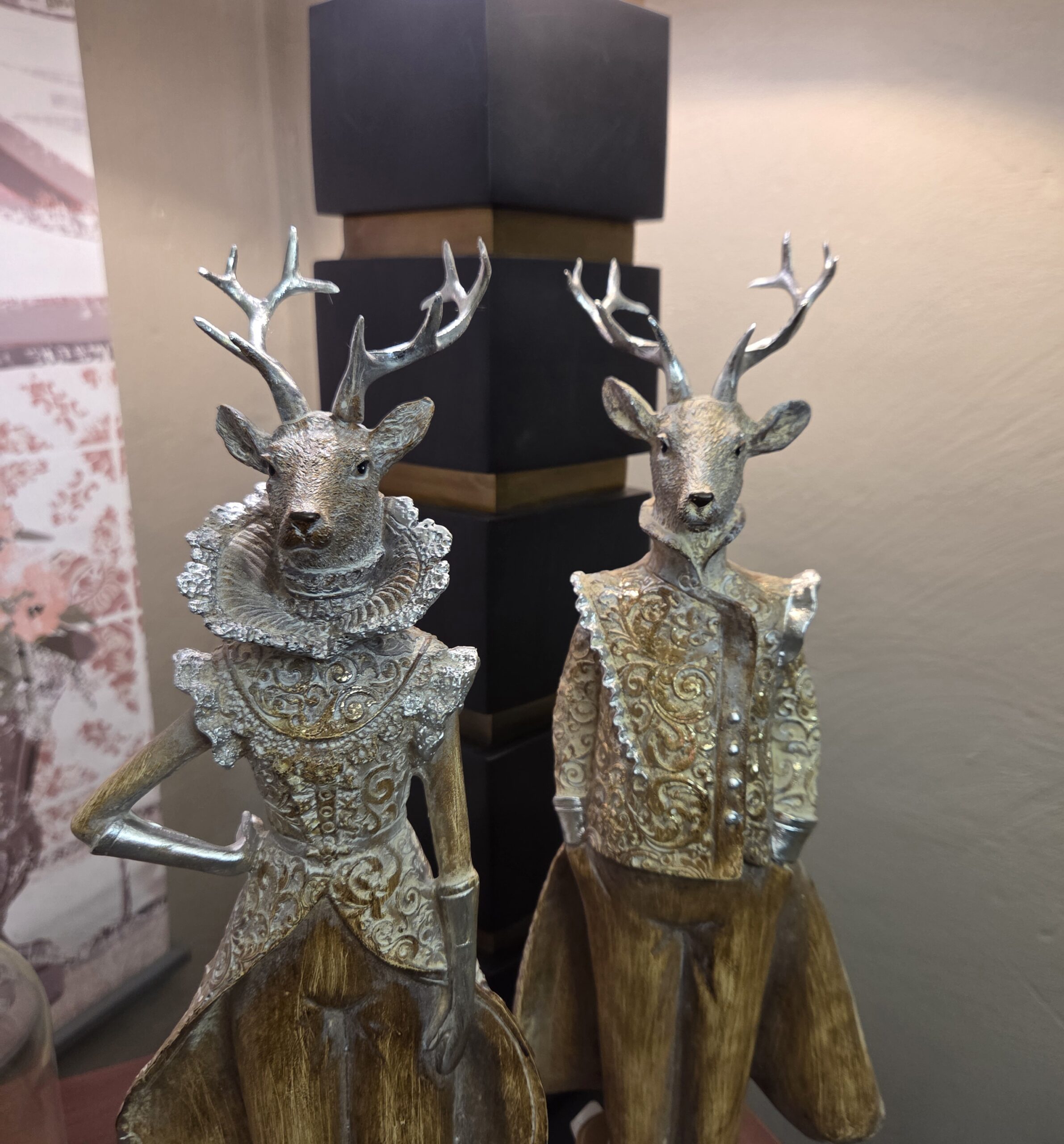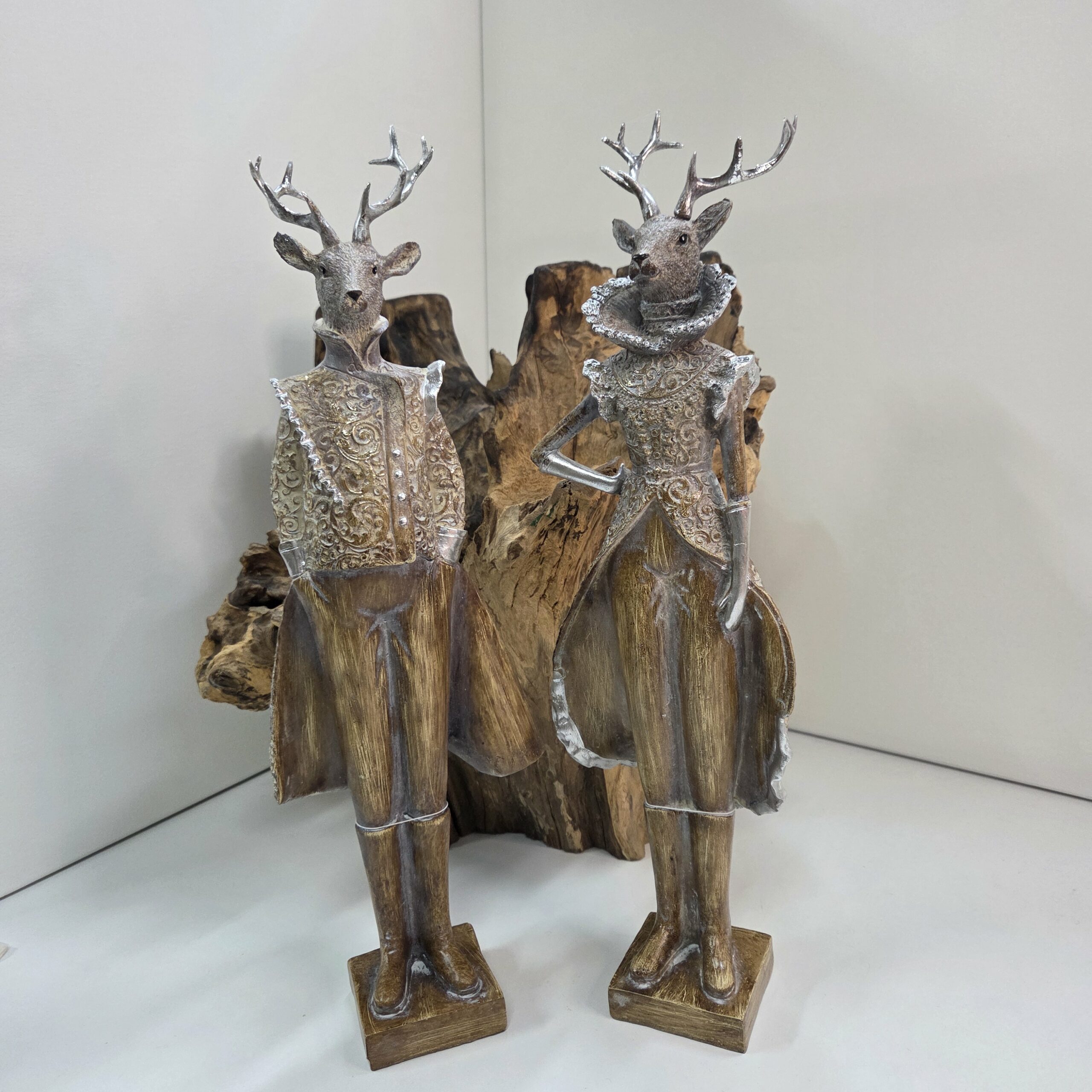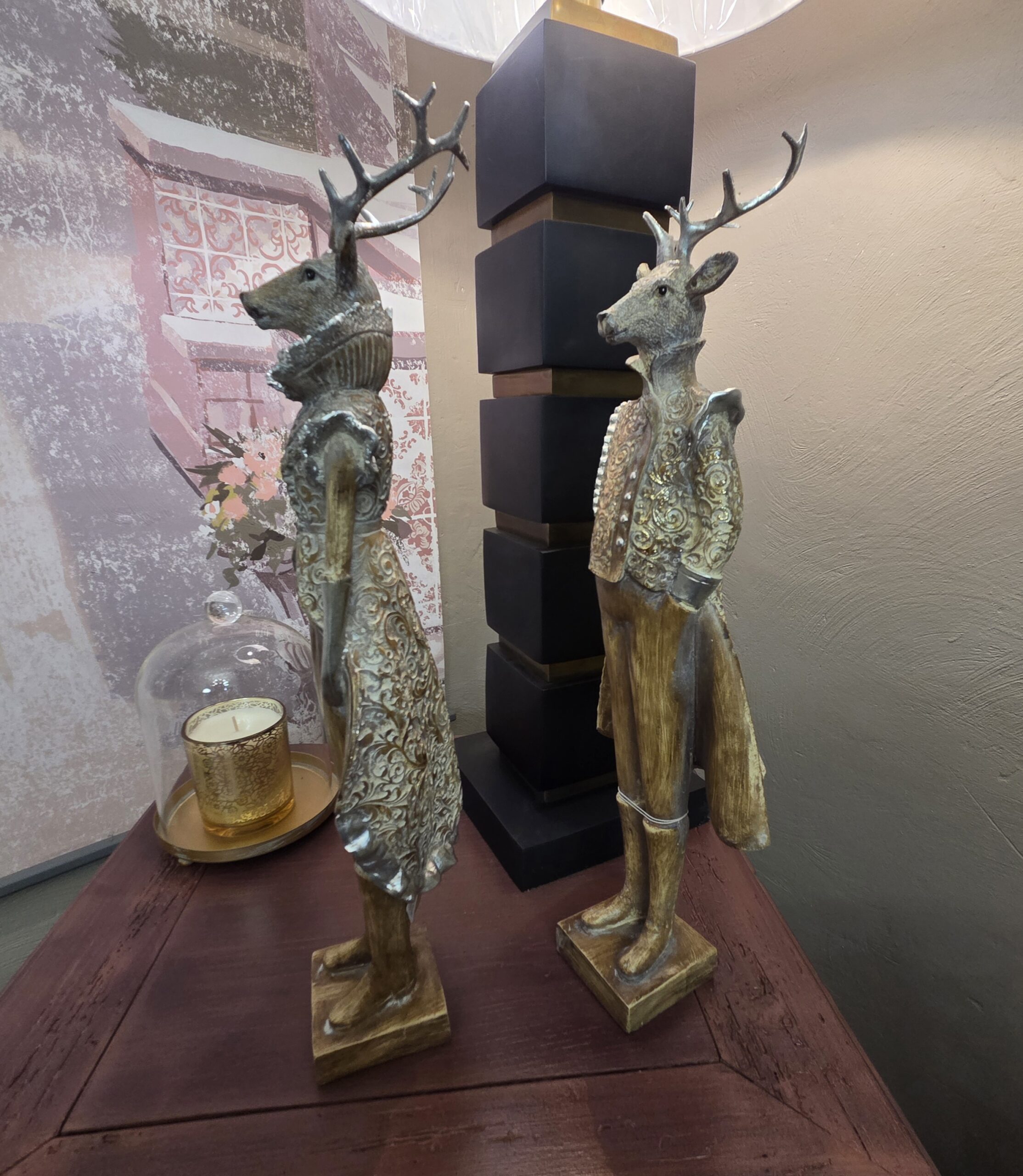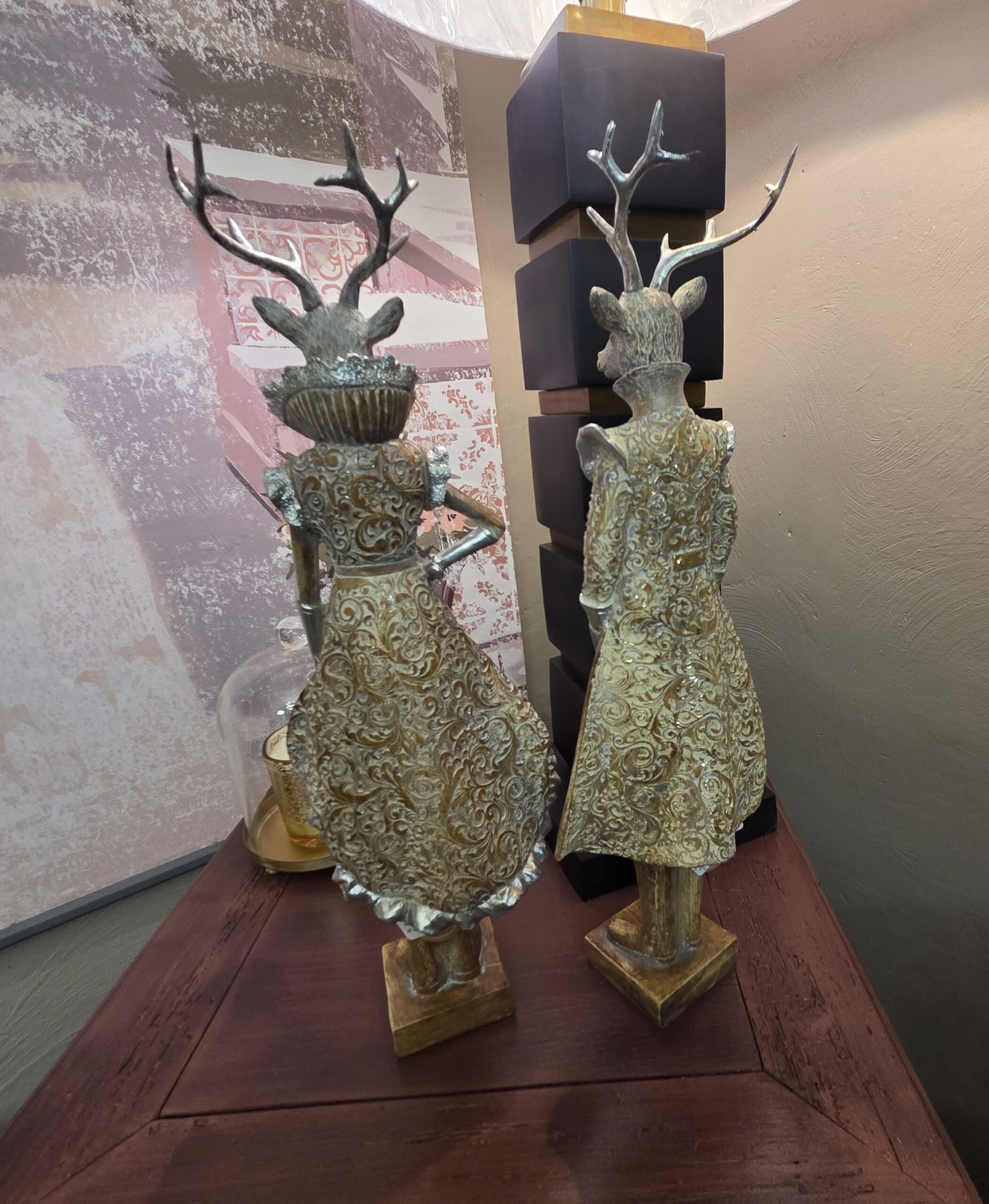 Cet élégant cerf mâle viendra apporter une touche d’originalité, un appel à la forêt. Déposez le sur une cheminée, une marche d’escalier, un buffet… Très stylé et classieux il épatera vos convives. Et pour l’accompagner vous pouvez rajouter sa compagne également disponible et tout aussi chic, tous deux parés de brun, de doré et d’argent.