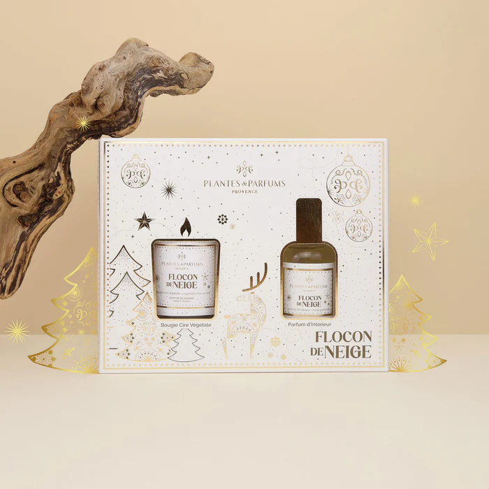 Vivez la féerie de l’hiver avec le Coffret Flocon de Neige de chez Plantes & Parfums de Provence, réunissant une Bougie 75 g et un Parfum d’Intérieur 50 ml. Les notes fraîches et pétillantes d’aiguilles de pin, d’orange et de muscade évoquent un matin enneigé, tandis que le cèdre, les baies St Thomas et la cannelle apportent chaleur et réconfort. En fond, la mousse, la fève tonka et le musc enveloppent chaque pièce d’une douceur cristalline et apaisante. Un coffret élégant et léger, parfait pour créer instantanément une atmosphère cocooning et féerique chez vous. Vivez la féerie de l’hiver avec le Coffret Flocon de…